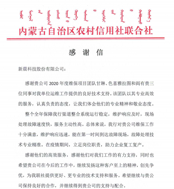 内蒙古农村信用社感谢信